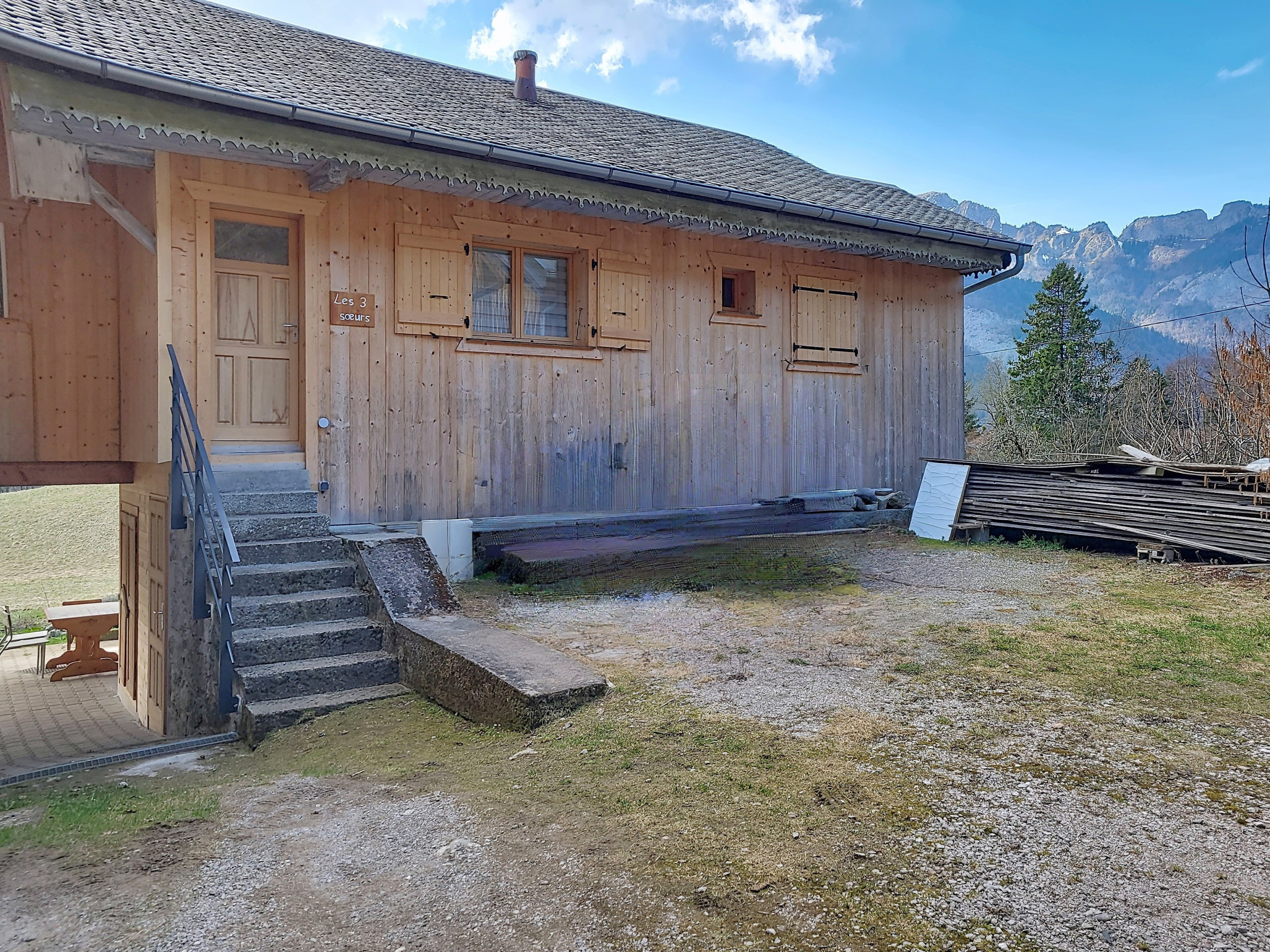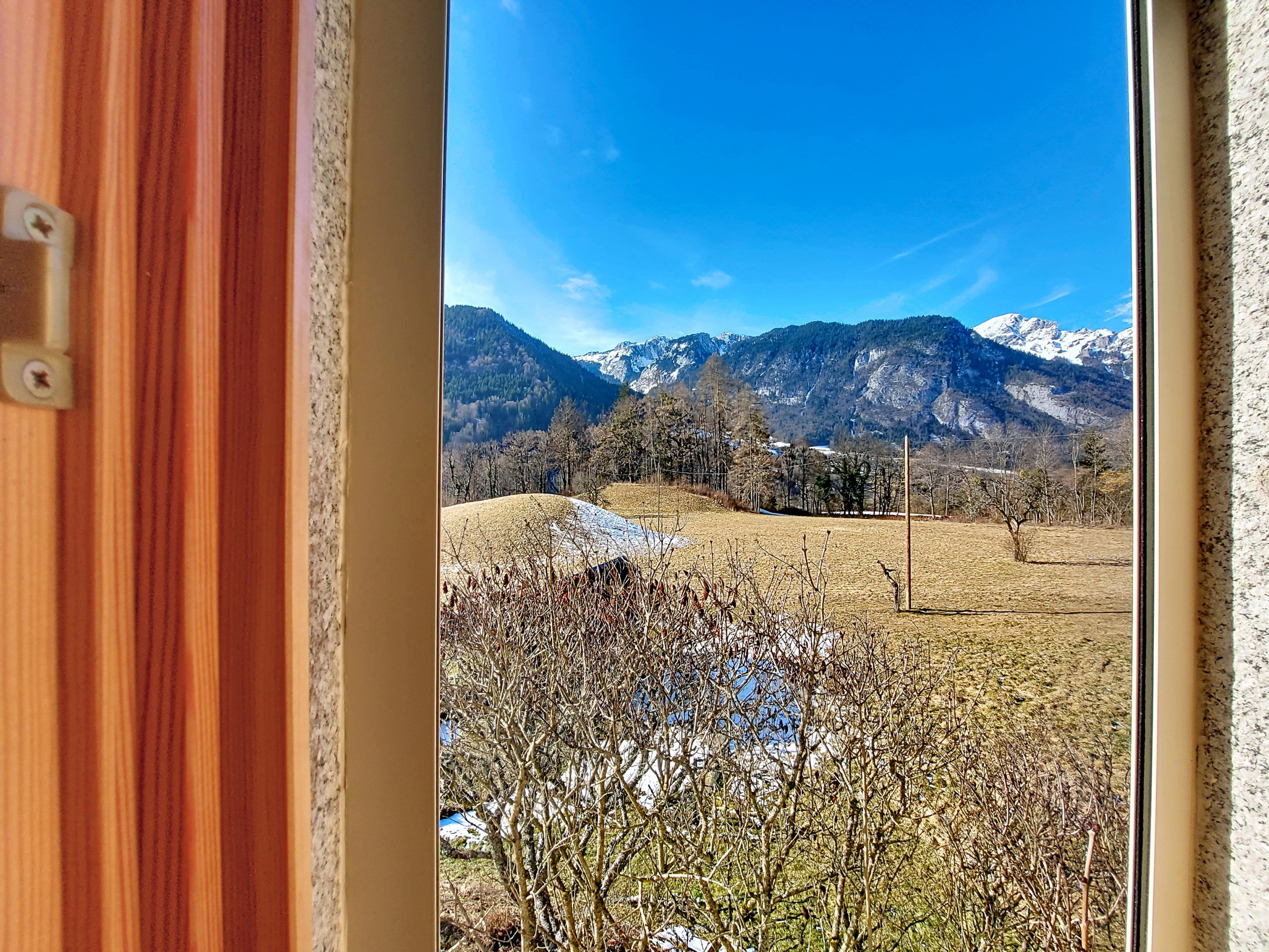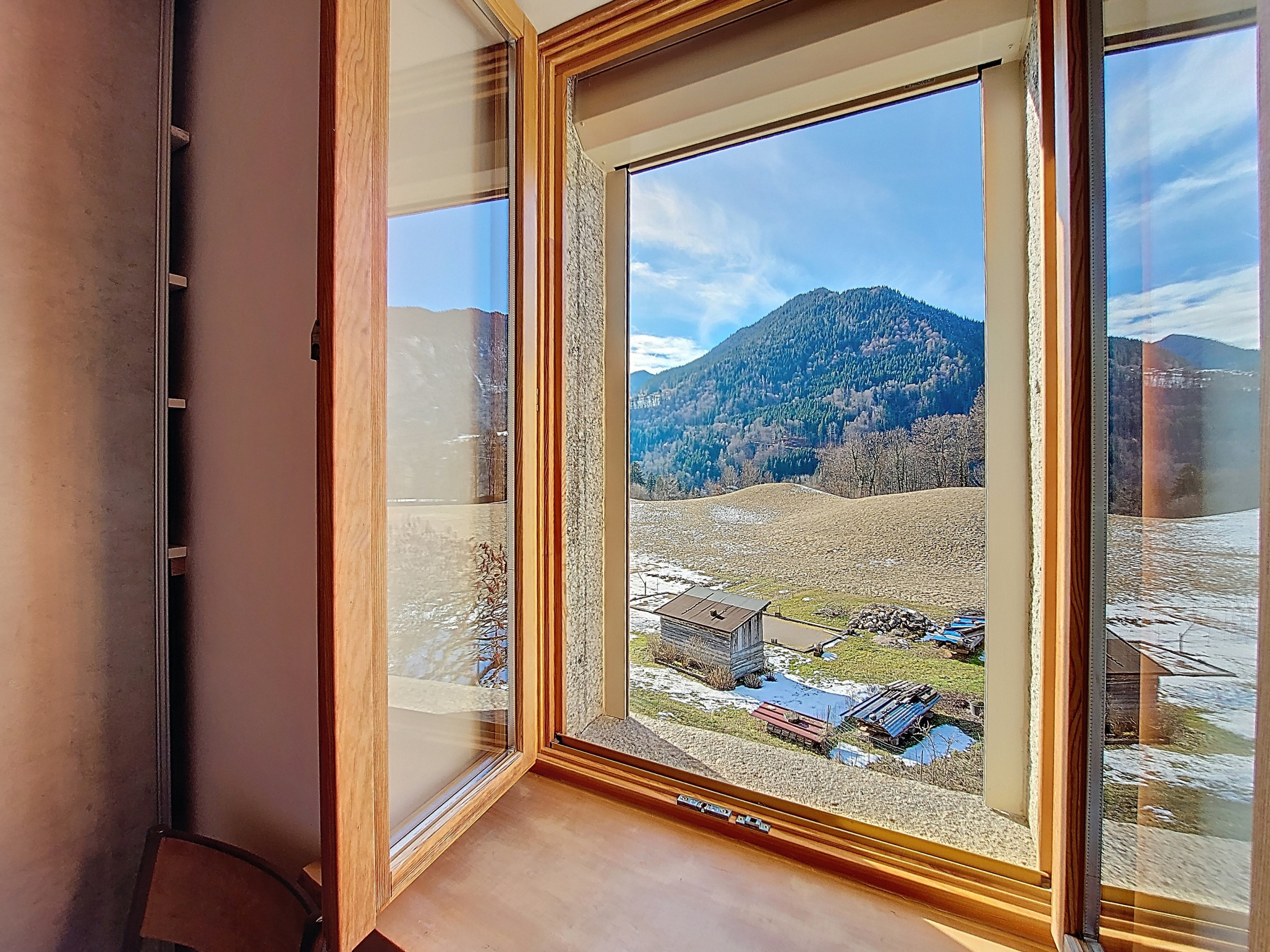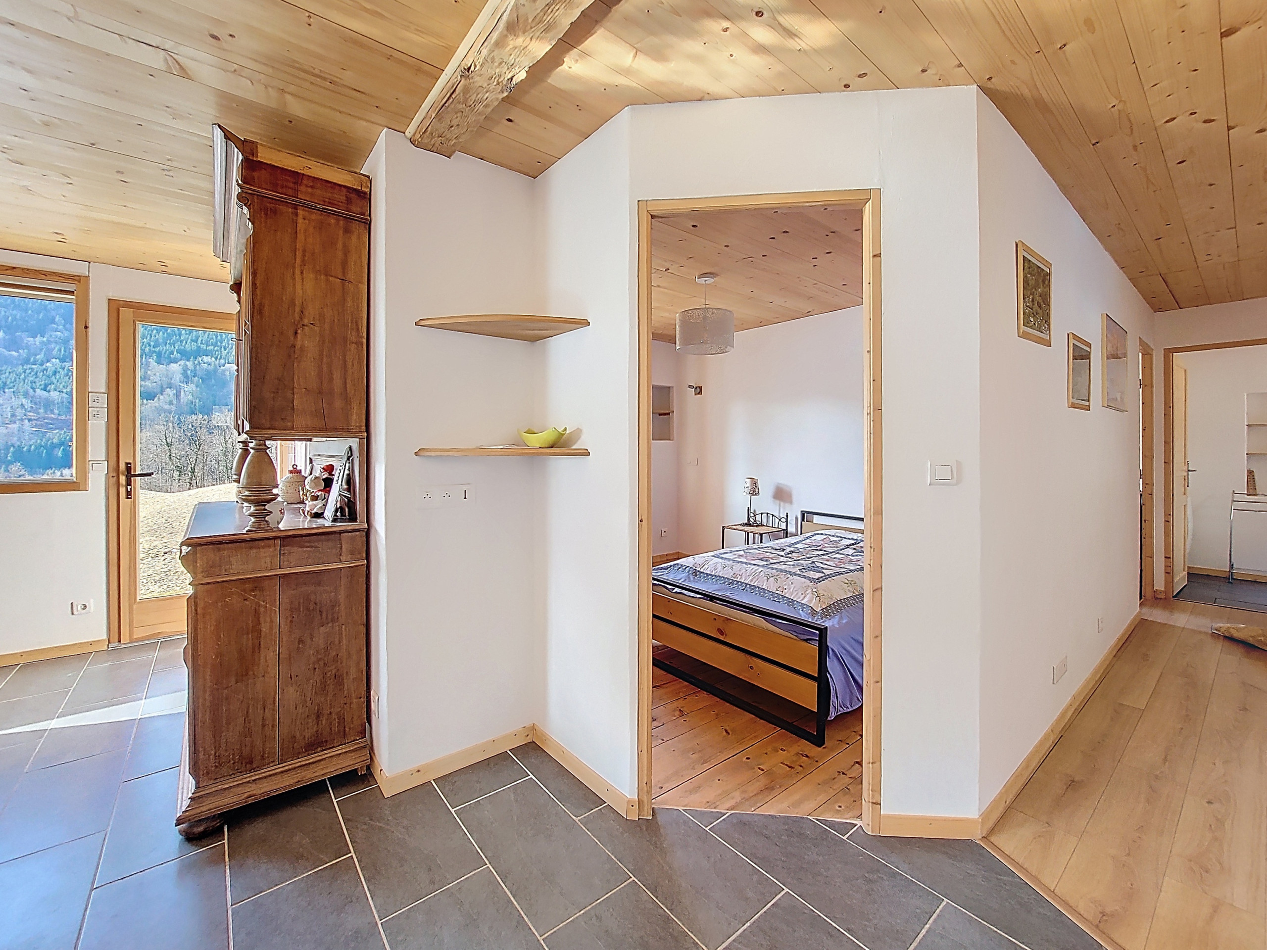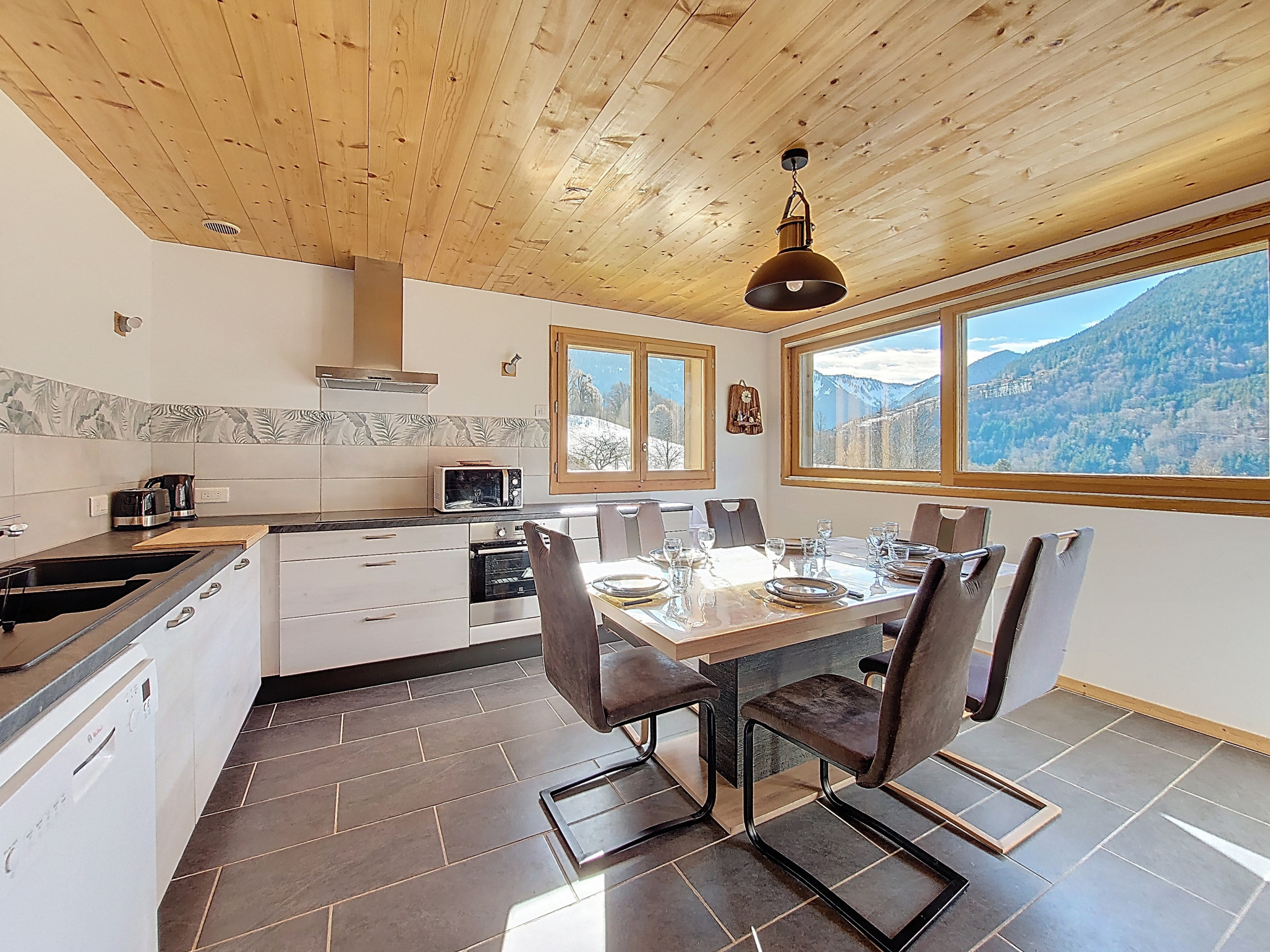 - Dining area: a large friendly table with six chairs, in a bright room offering a superb unobstructed view of the mountains.