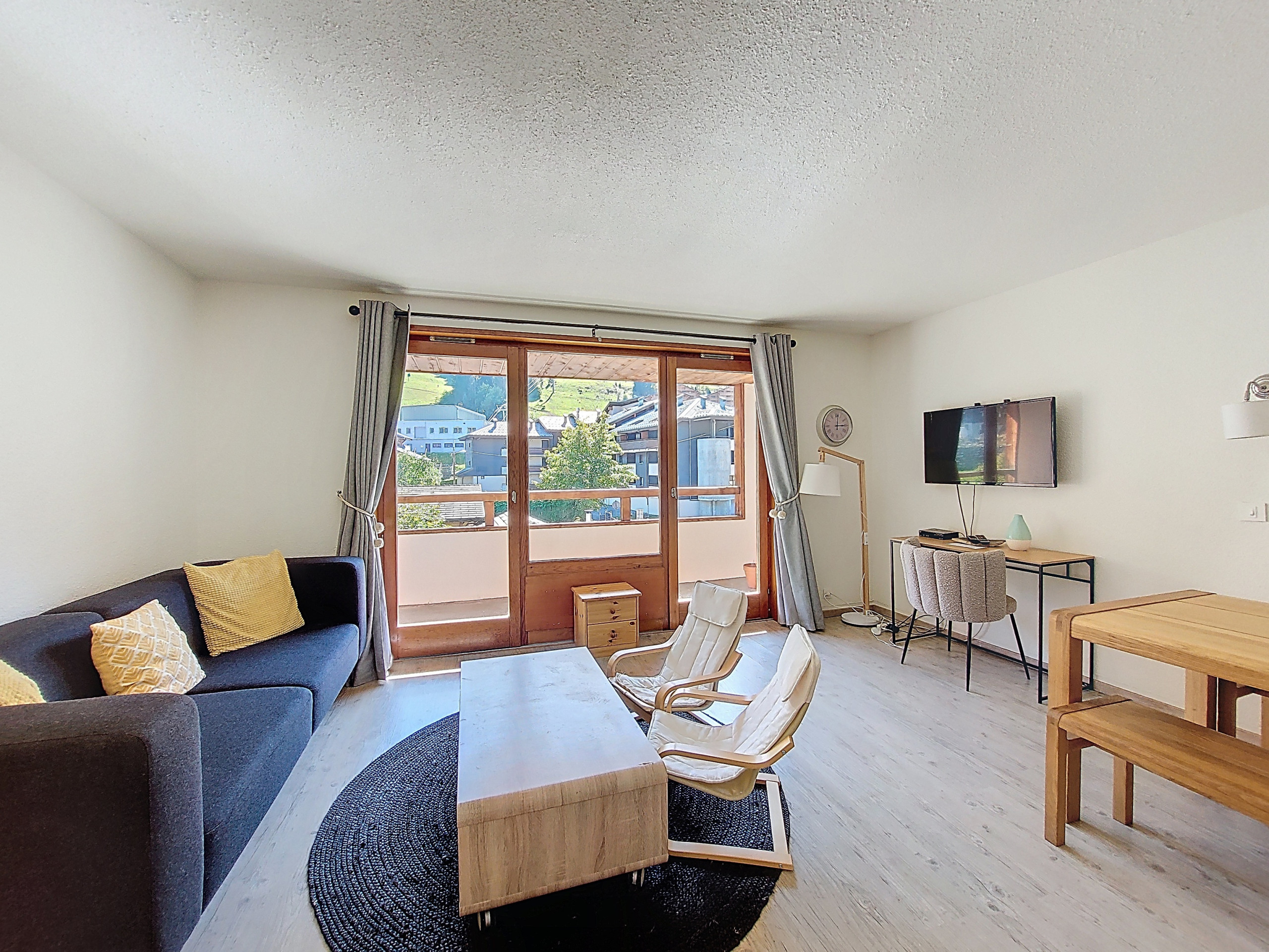 A large bay window giving access to the spacious south-facing balcony with magnificent views of the ski slopes of Roc d'Enfer and the mountains (Nantaux)