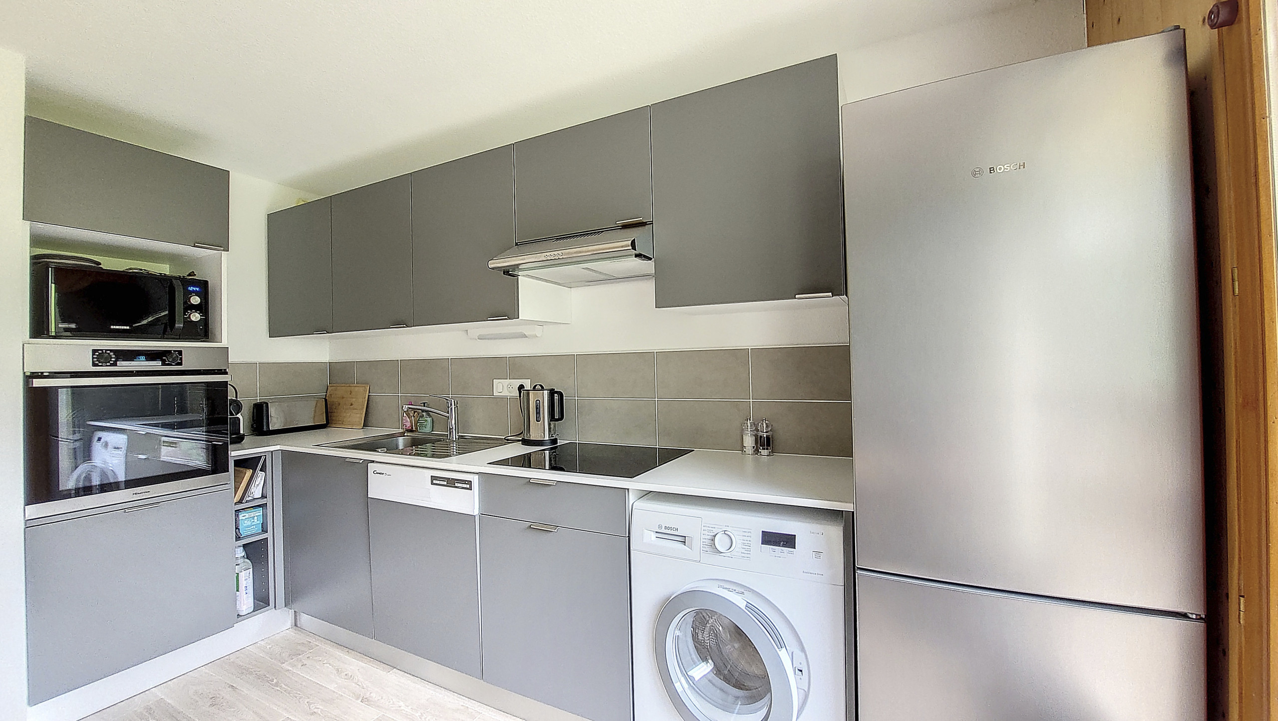 - 1 large main room kitchen/dining room with dining area for 6 people /living room with view of the slopes west facing including: