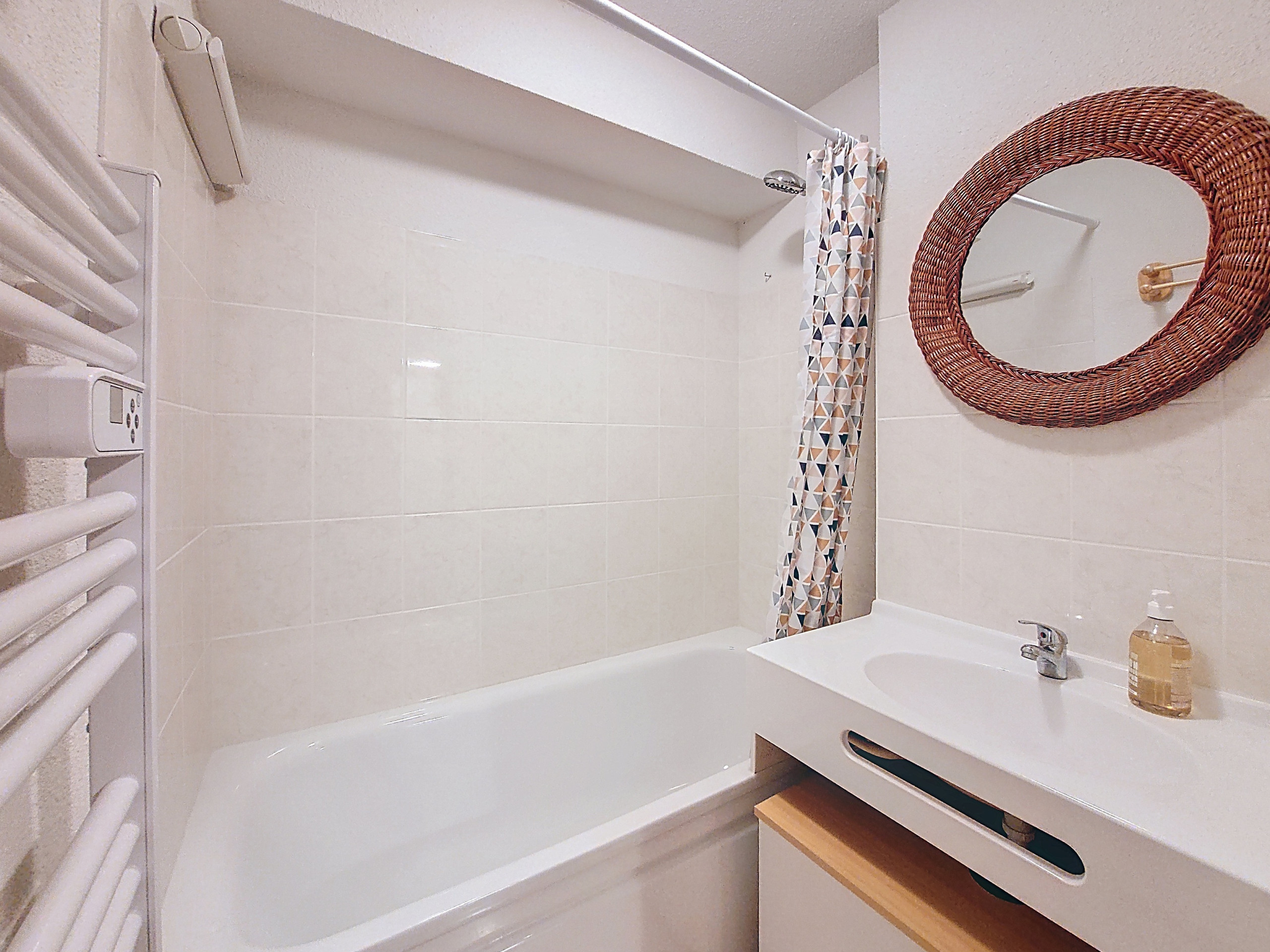 - 1 bathroom with bathtub, washbasin, mirror, towel rail