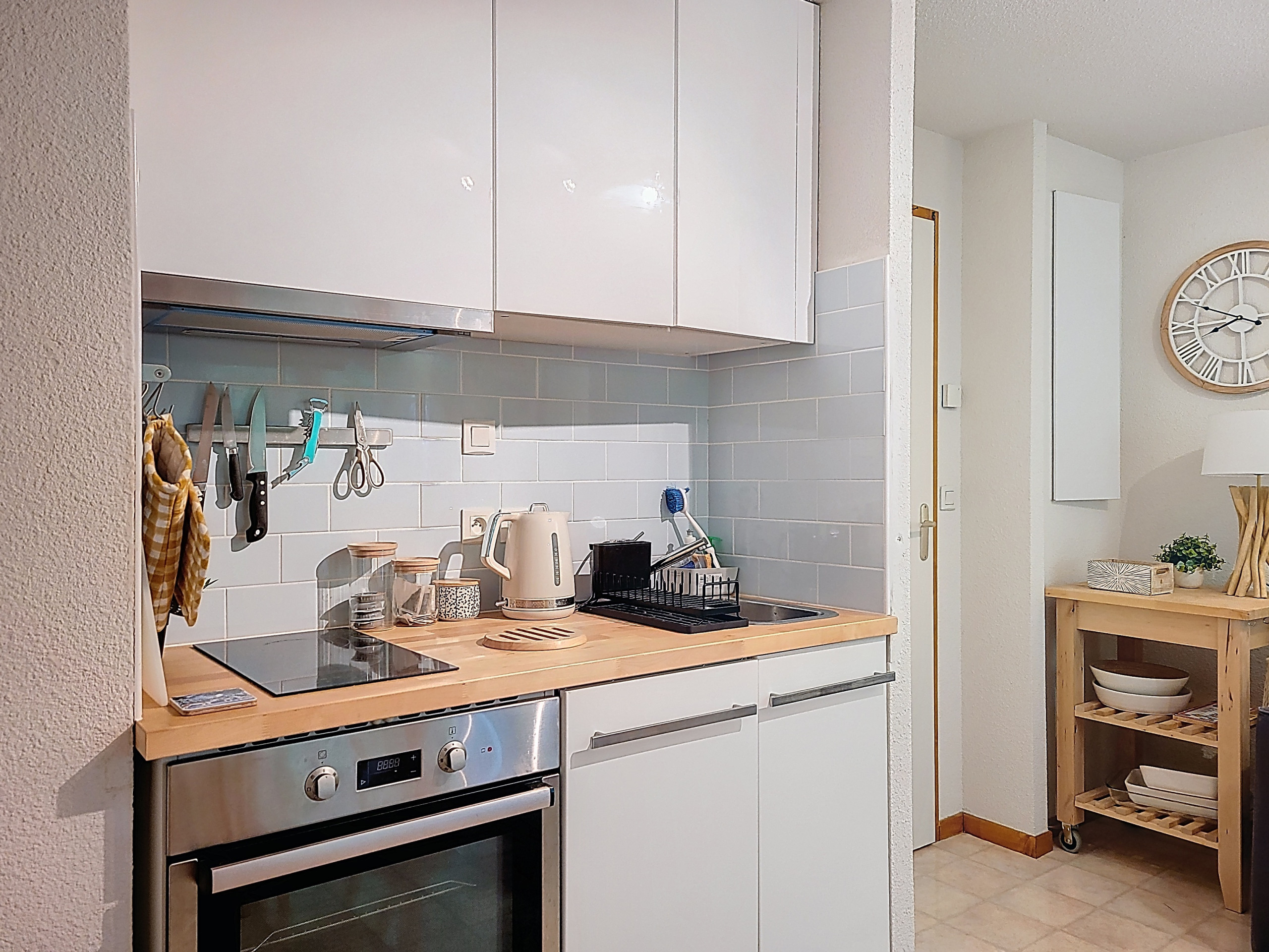 A fully equipped kitchen with dishwasher, oven and induction hob, coffee maker, kettle, toaster and a dining table that can accommodate up to 6 people