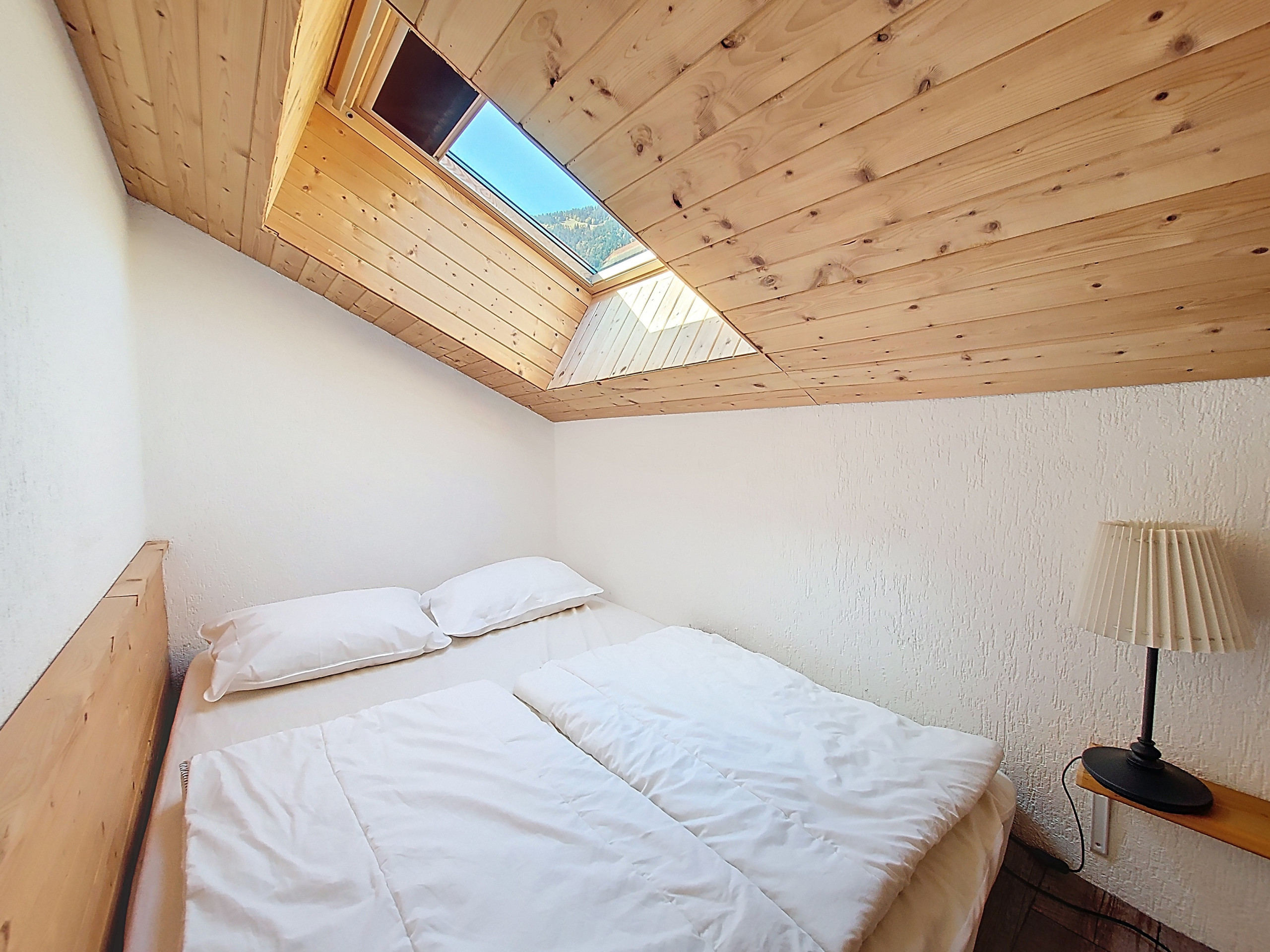 - Then, access to the mezzanine of 3.75 m² with a double bed (140 x 200), (2 single duvets) Velux, mountain view