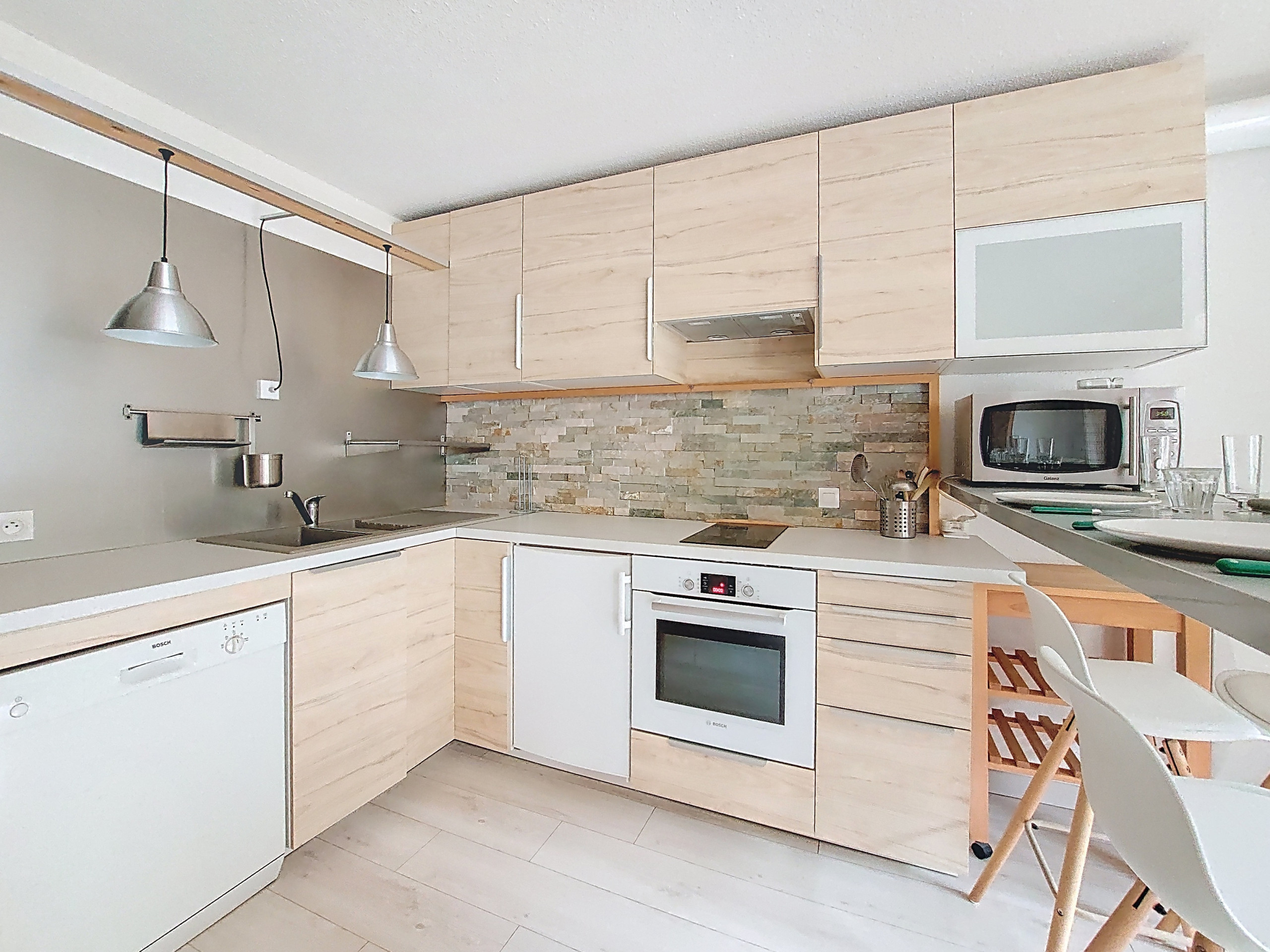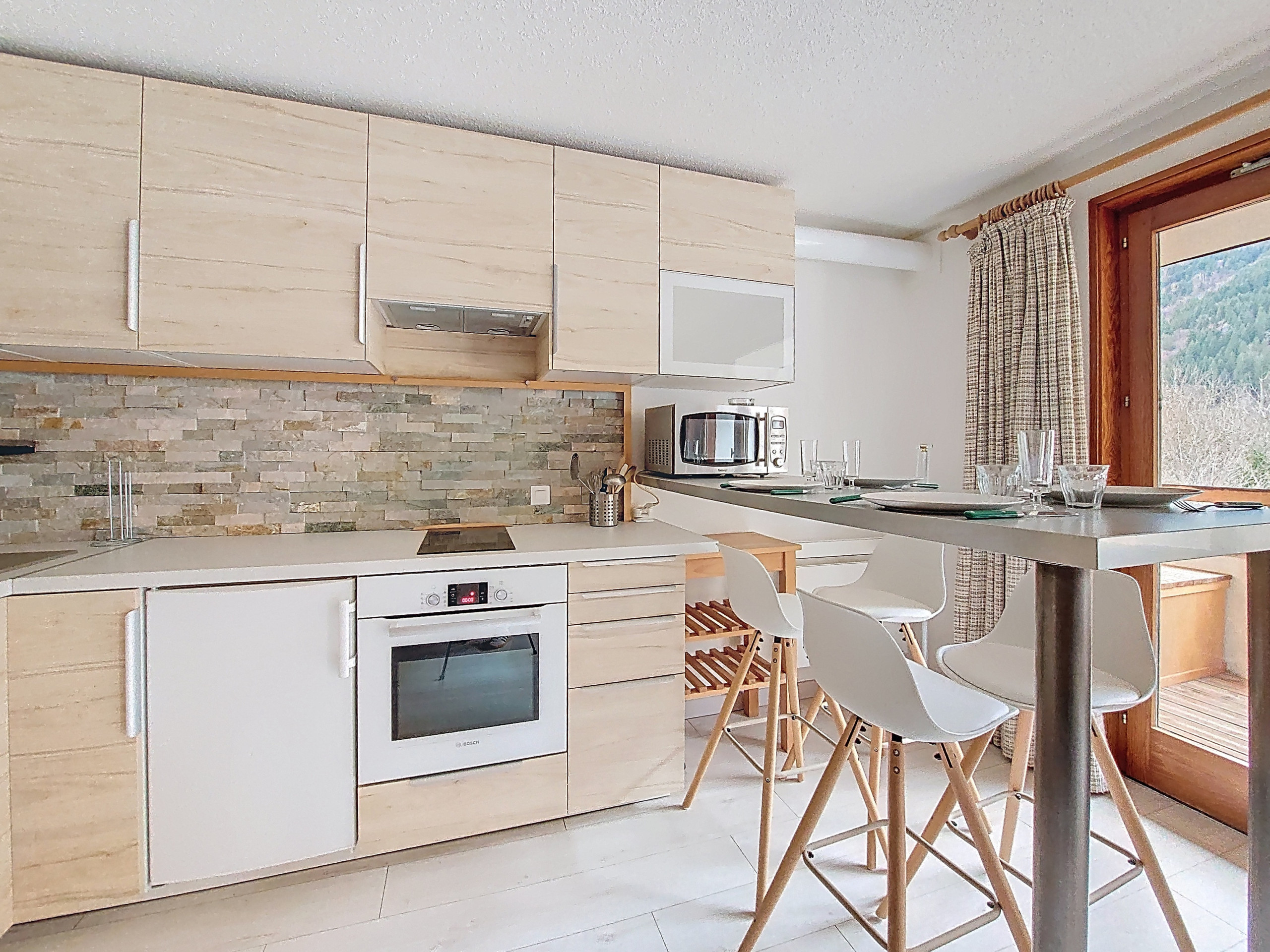 A fully equipped kitchen with fridge/freezer, a dishwasher, a kettle, a toaster, a microwave, a sink, an oven, a 2-burner induction hob, a raclette maker and a fondue maker