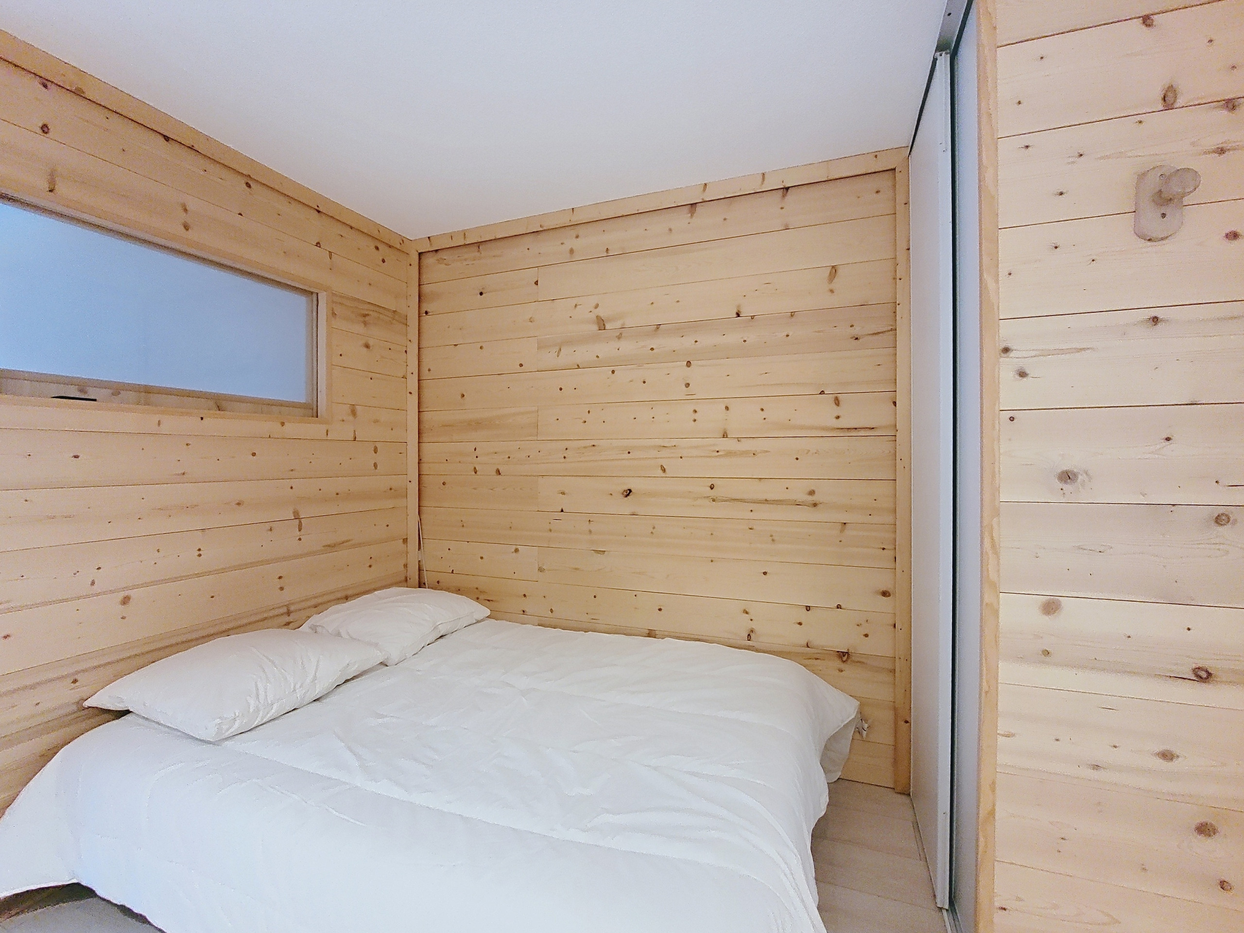 An entrance with a fitted corner converted into a bedroom with a double bed.