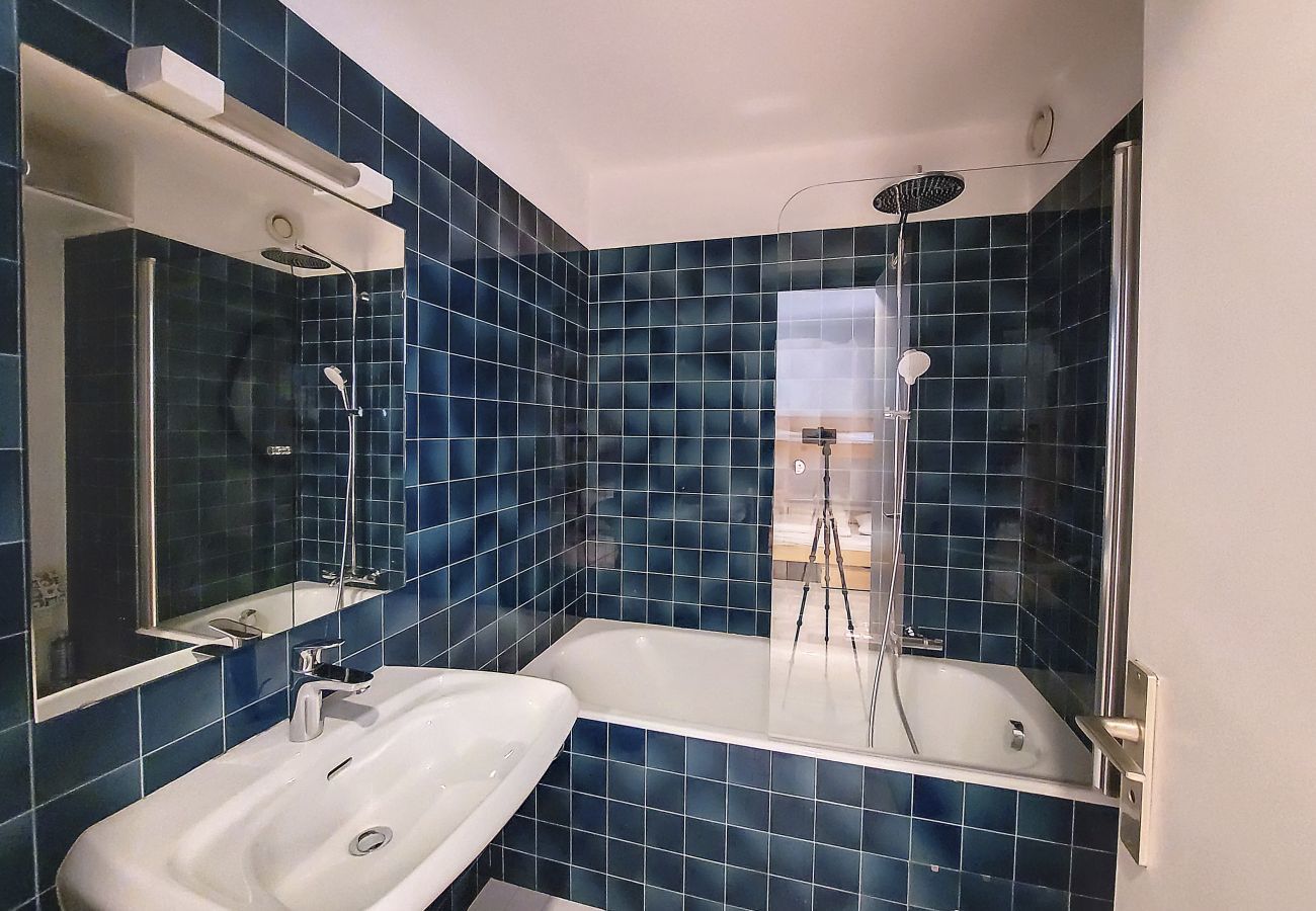 - Une salle de bain avec baignoire, une vasque, sèche serviettes et penderie. Il y a également un WC et une machine à laver